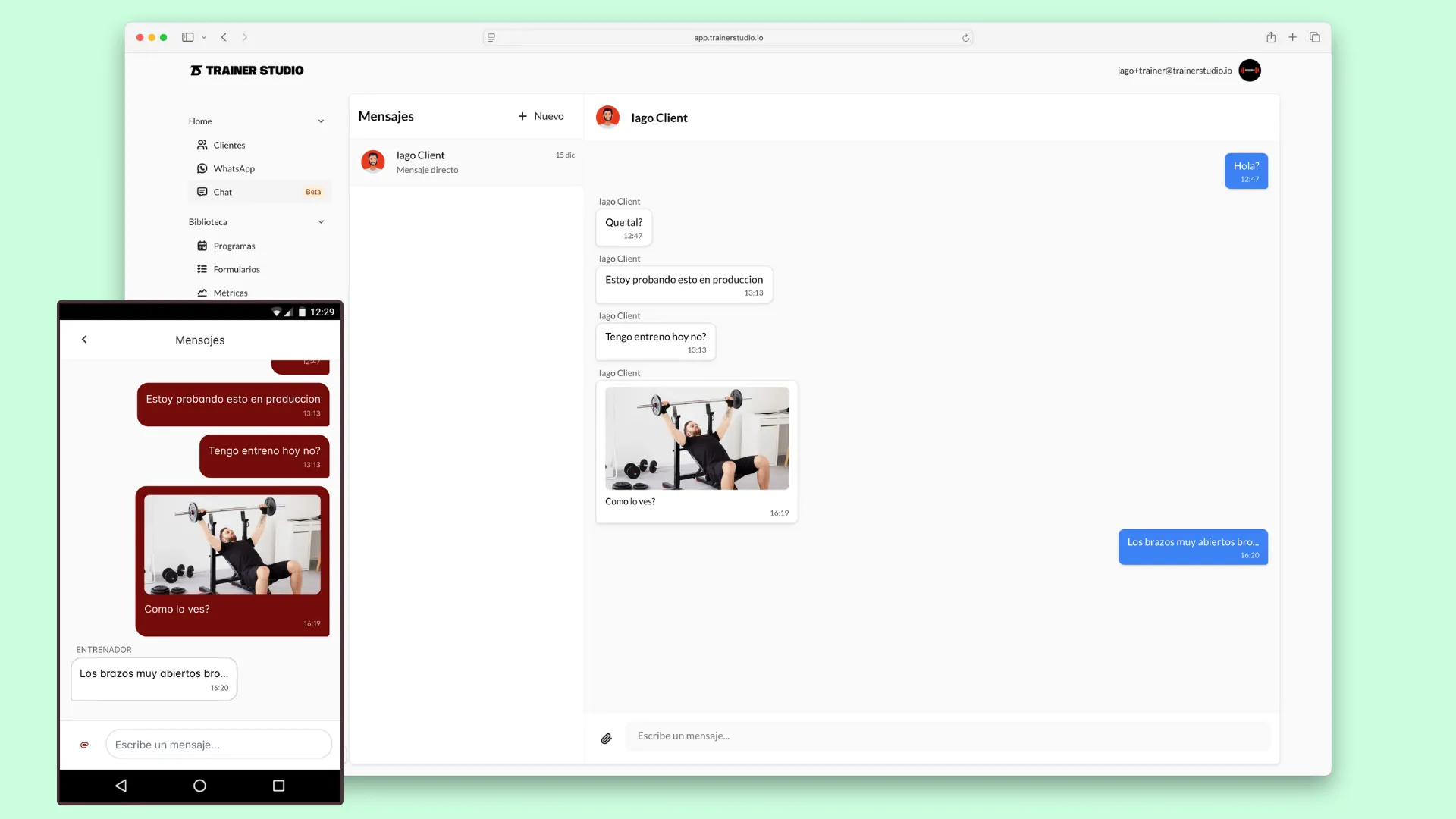 El chat de TrainerStudio funciona con conversaciones directas 1 a 1 entre tú y cada cliente. Este formato es ideal para: