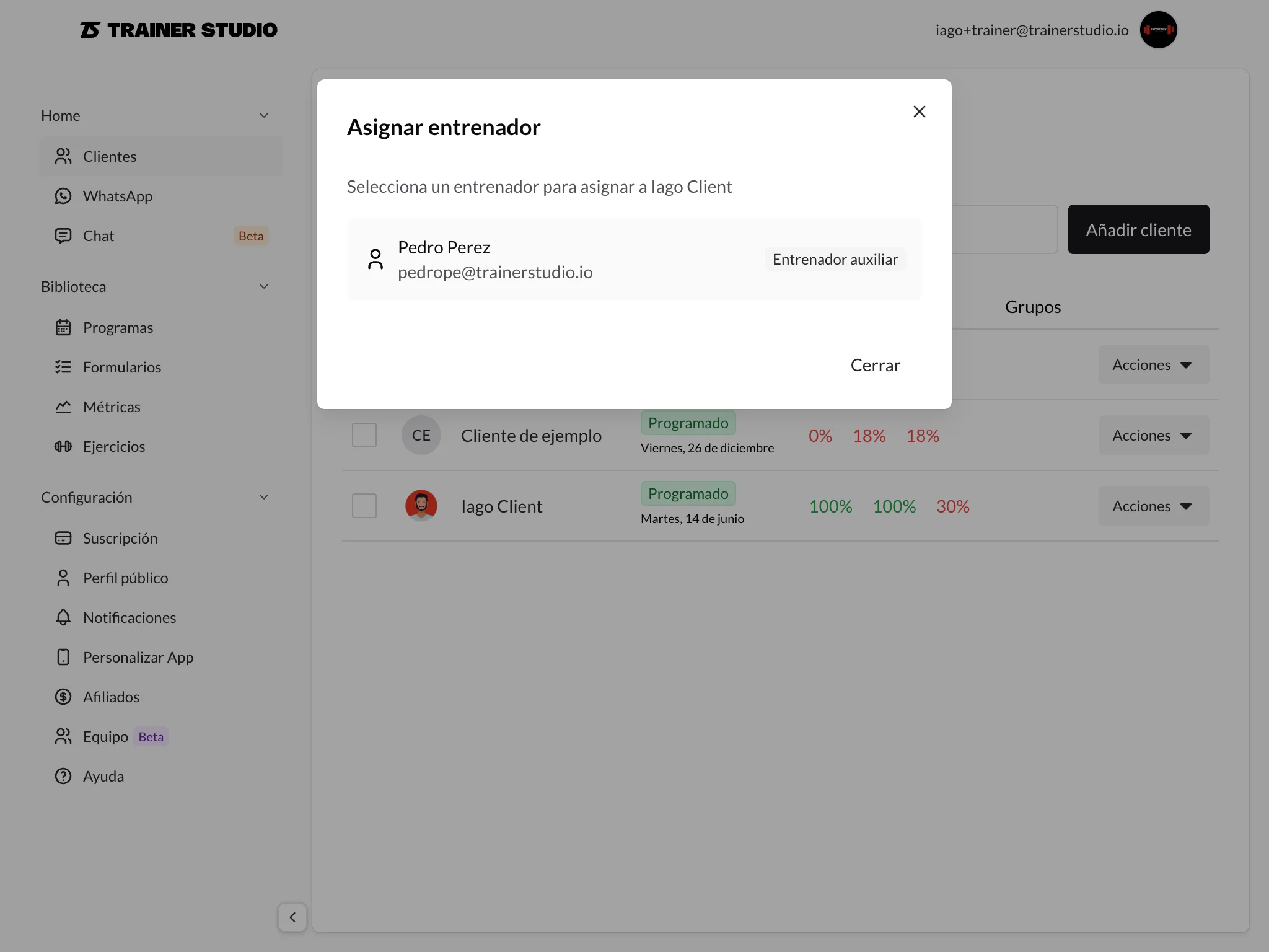 Para un entrenador junior que trabaja con algunos clientes bajo tu supervisión, dale permisos para ver ejercicios y programas, ver clientes asignados y editar clientes asignados. No le des permisos para crear o eliminar recursos, solo para usar lo que ya existe. Asigna sus clientes específicos.