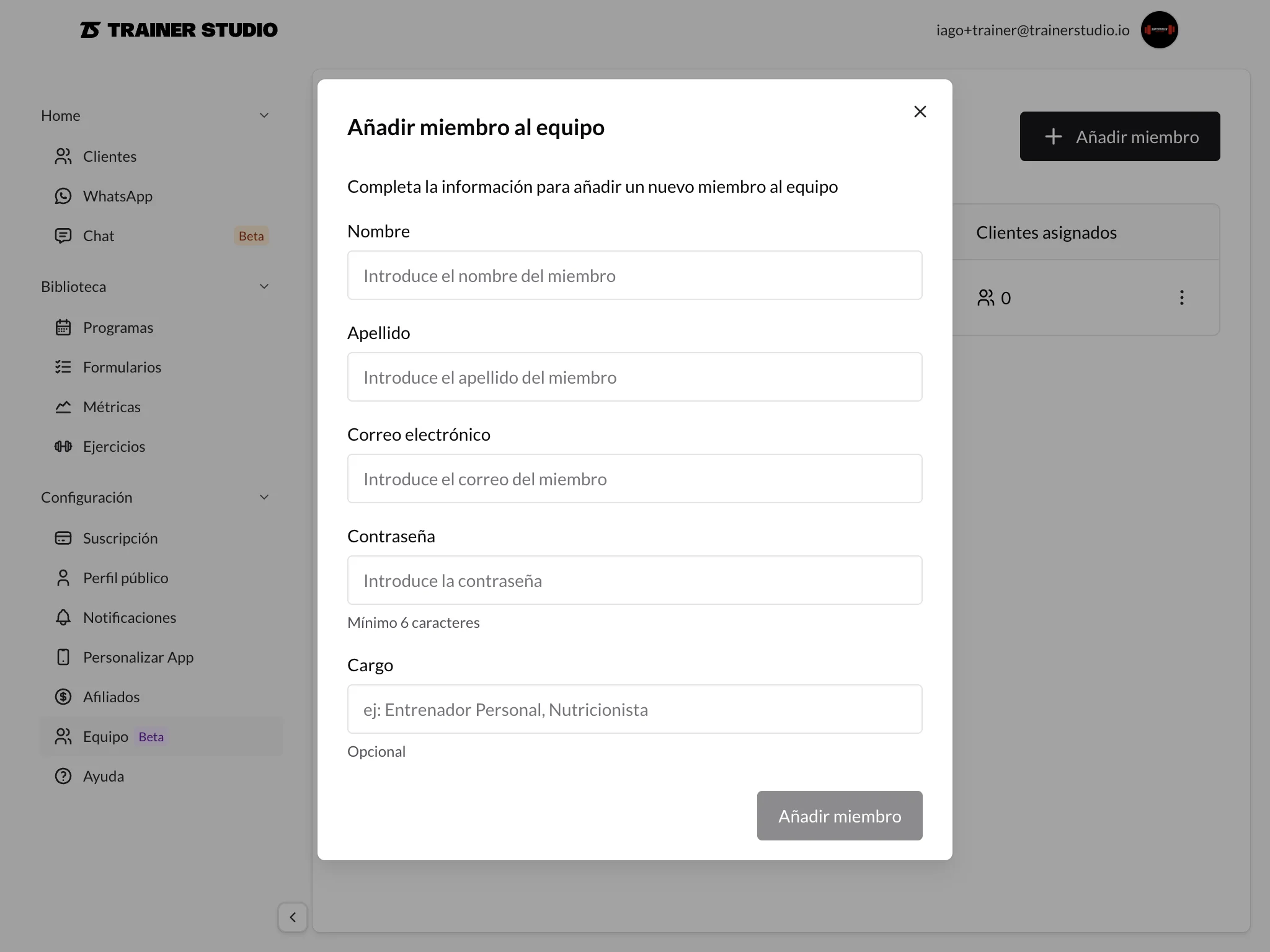 Una vez completados los datos, haz clic en "Añadir miembro" y el empleado quedará creado. Puedes compartirle las credenciales (email y contraseña) para que pueda iniciar sesión en TrainerStudio.