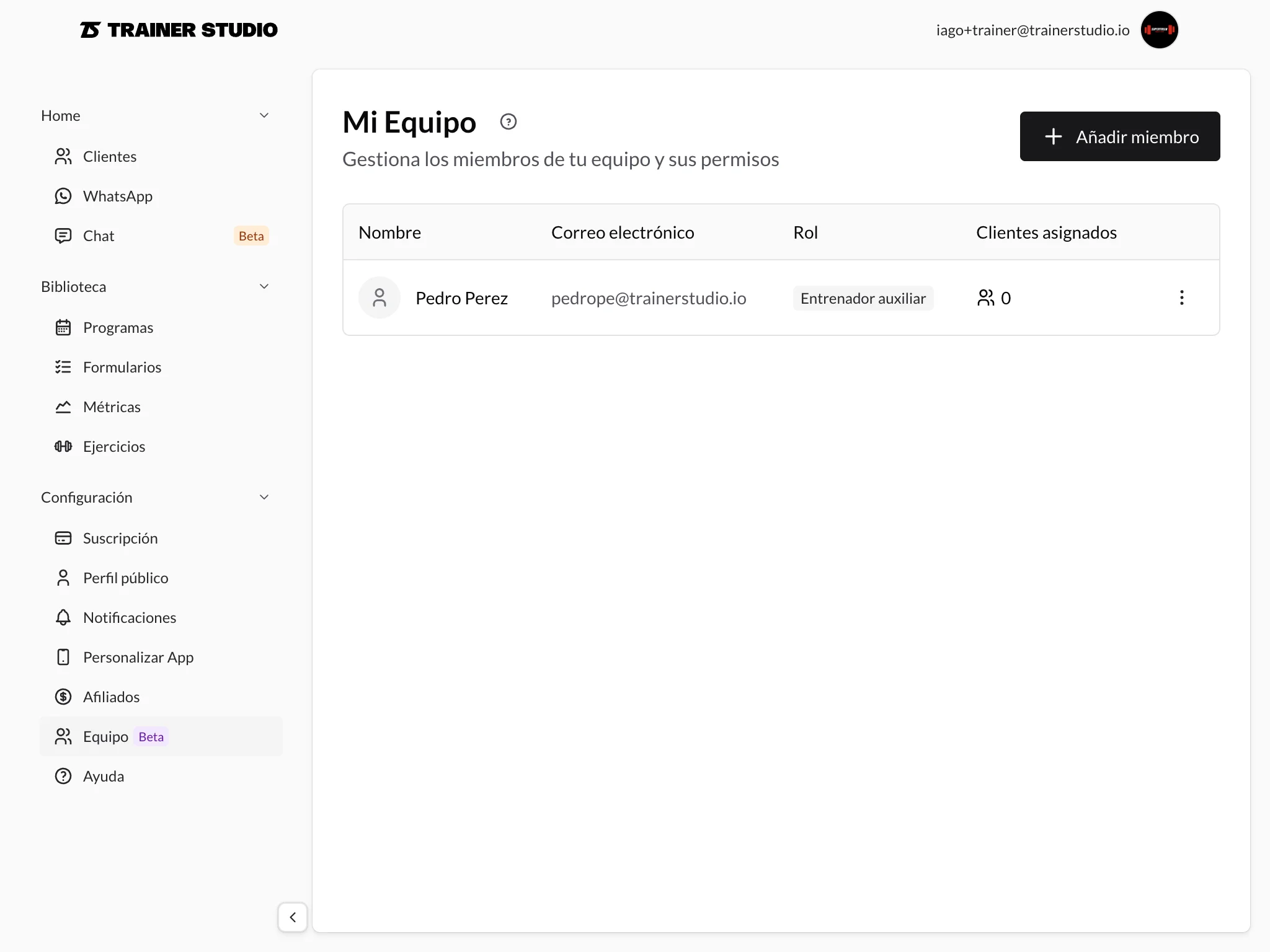 La funcionalidad de Equipos te permite añadir empleados a tu empresa dentro de TrainerStudio y controlar qué permisos tienen.