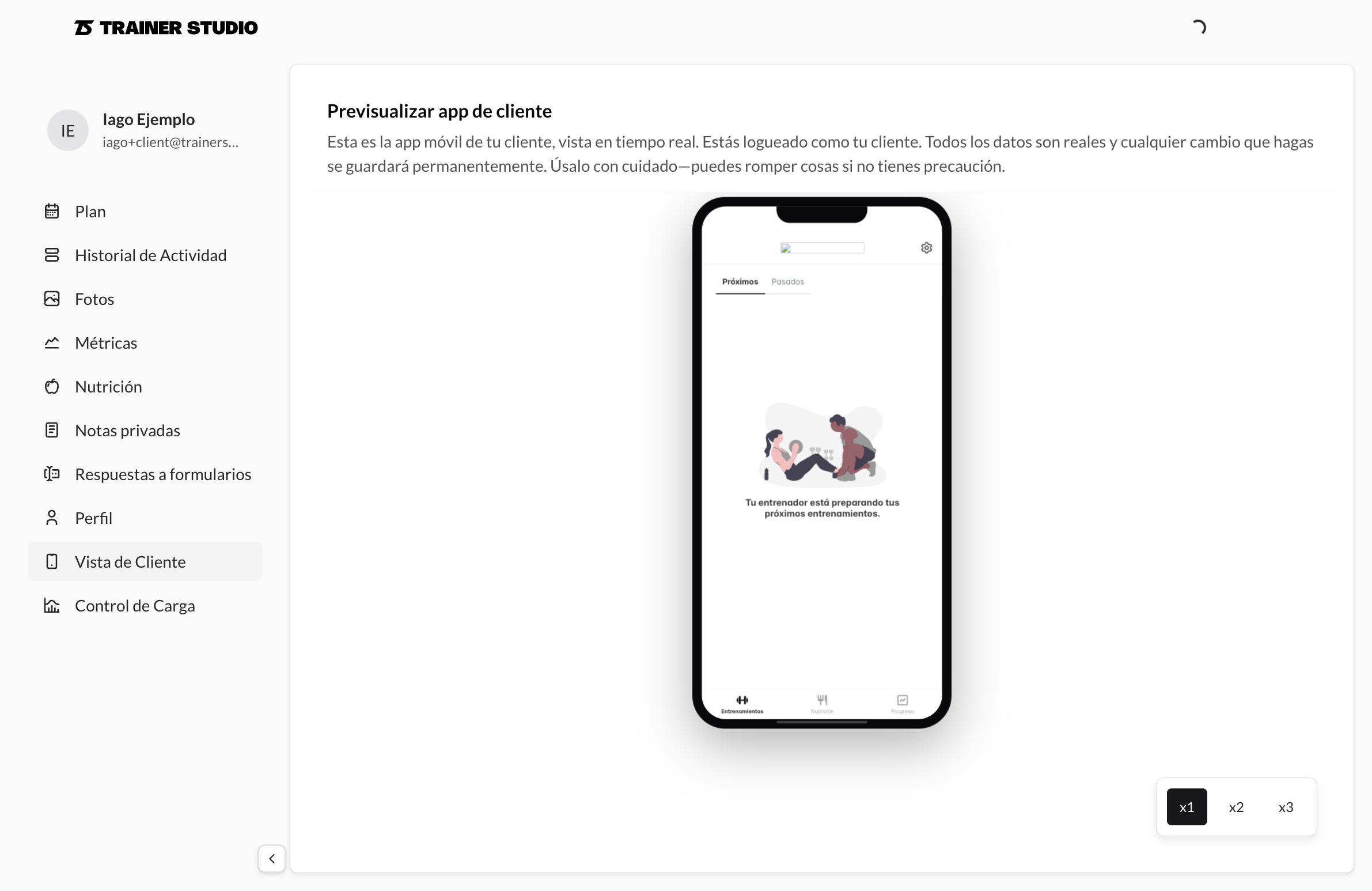 ¿Quieres ver exactamente lo que ve tu cliente cuando abre su aplicación? TrainerStudio te permite ver la app como si fueras tu cliente, directamente desde tu panel de entrenador.